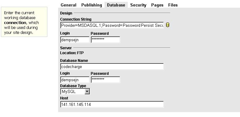 Now you're ready to enter the information about your database. Enter the name of your database, and the login and password you use to connect to it. Next, select the Database Type. For our purposes, I will select MySQL. Finally, enter the IP of on which MySQL is running. If you do not know this, or if you try to enter the IP of the server you log into, and it does not work, e-mail your hosting provider or System Admin. Sometimes MySQL servers are run on different IP's than the web documents to better organize the backend systems.