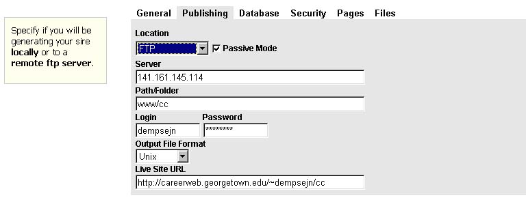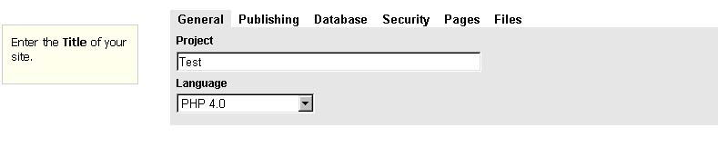 This is where you will configure your website creation process. Enter a Project title, and select a language. For this example, I will use "Test" and PHP 4.0. Next, click on the Publishing tab. You will see this: